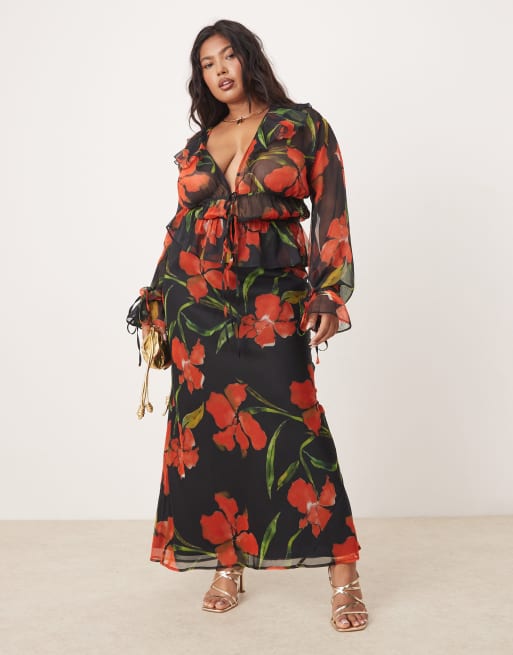 ASOS DESIGN Curve – Blommig, långärmad topp i chiffong med volang och knytning, del av set