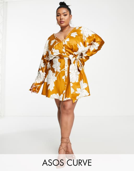 ASOS DESIGN – Curve - Senapsgul blommig miniklänning i satin med pingvinärmar, knäppning framtill och knytning framtill