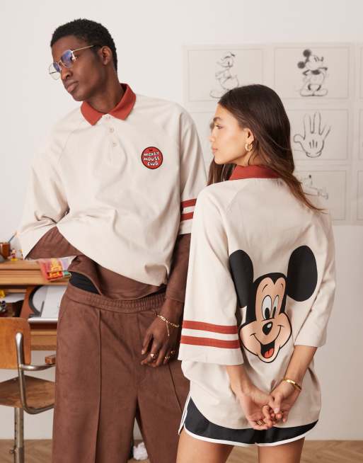 ASOS DESIGN – Disney – Beige oversize pikétröja i unisex-modell med raglanärmar och Musse Pigg-tryck