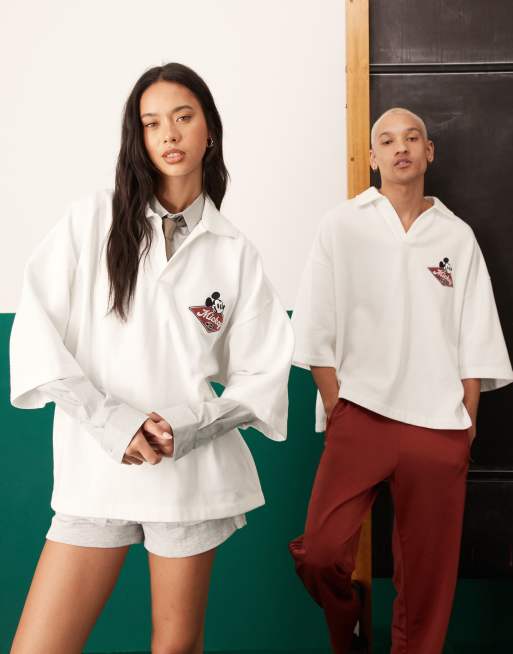 ASOS DESIGN – Disney – Naturvit, oversize pikétröja i unisex-modell med broderat Musse Pigg-tryck