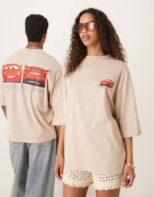 ASOS DESIGN – Disney Pixar Cars – Beige t-shirt i unisex-modell och oversize med Lightning McQueen-tryck