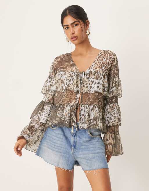 ASOS DESIGN – Djurmönstrad blus i chiffong och bohostil med volang