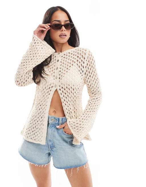 ASOS DESIGN – Elfenbensvit, hålstickad kofta med rak halsringning