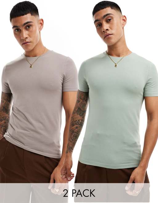 ASOS DESIGN – Essential – Brun och ljusgrön t-shirt i muscle fit, 2-pack