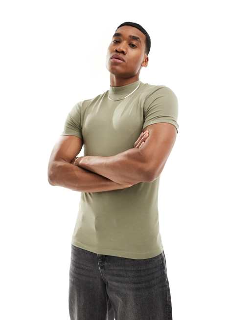 ASOS DESIGN – Essential – Kakifärgad t-shirt i muscle fit med hög krage