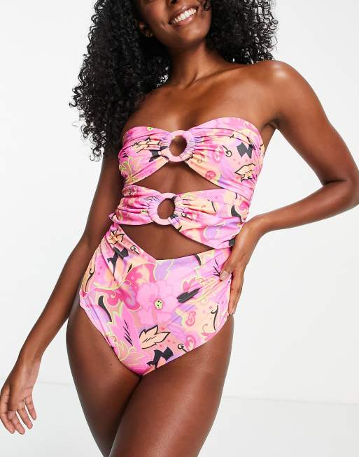 ASOS DESIGN – Färgglad, blommig baddräkt med bandeau-ringning och ringdetalj