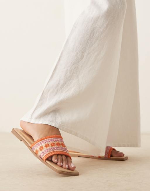 ASOS DESIGN – Fig – Naturfärgade, platta sandaler med broderi, öppen häl och fyrkantig tå