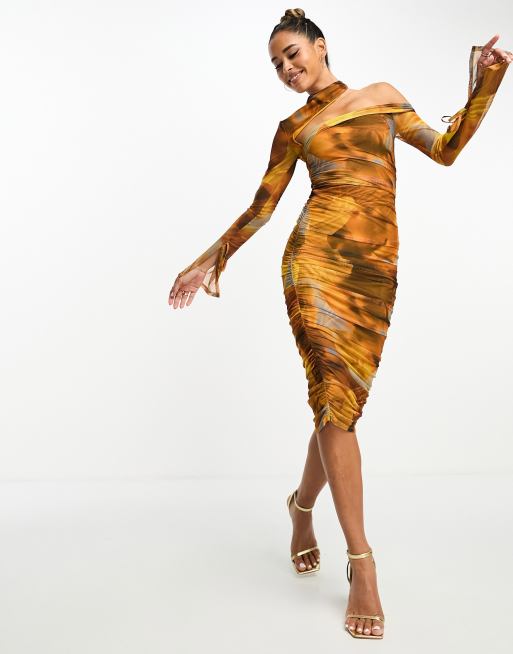 ASOS DESIGN – Fläckmönstrad midiklänning i rynkig mesh med asymmetrisk ärm