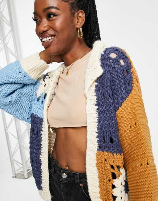 ASOS DESIGN – Flerfärgad virkad kofta i lapptäcksstil