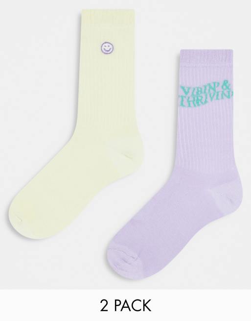 ASOS DESIGN – Flerfärgade strumpor med text och broderad smiley, 2-pack