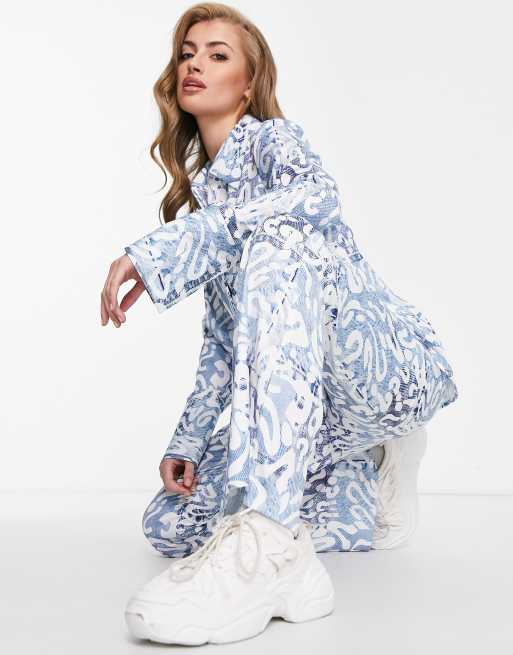 ASOS DESIGN – Frågeteckensmönstrade byxor med vida ben i dra på-stil av satin, del av set