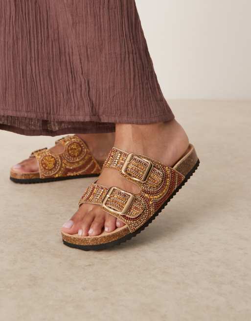 ASOS DESIGN – Funky – Bärnstensfärgade tofflor med två remmar och pärlor