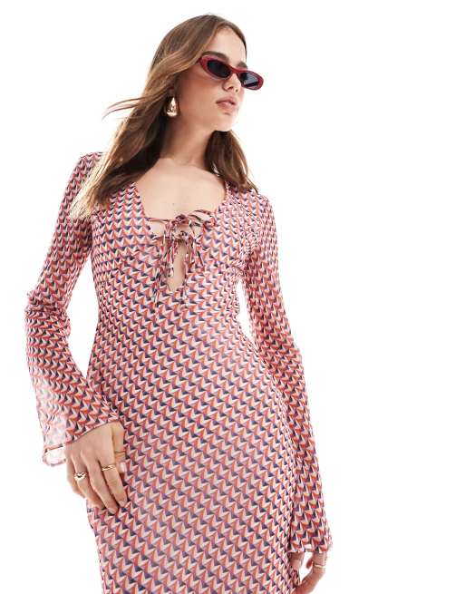 ASOS DESIGN – Geometriskt mönstrad maxiklänning med diagonalskuren kjol, lång ärm och knytning framtill