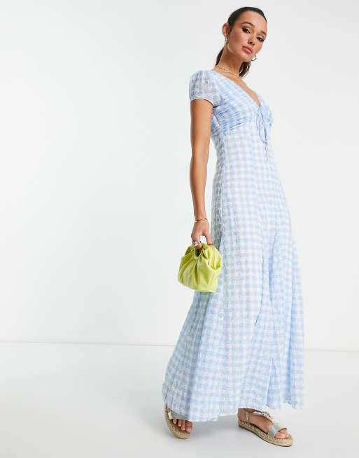 ASOS DESIGN – Ginghamrutig, broderad maxiklänning med rynkning och knytning