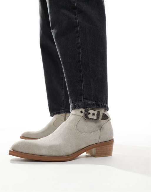 ASOS DESIGN – Grå chelseaboots av mocka med cuban heel och spänne i cowboystil