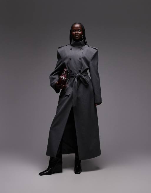 ASOS DESIGN – Grå, figursydd trenchcoat med axelvaddar