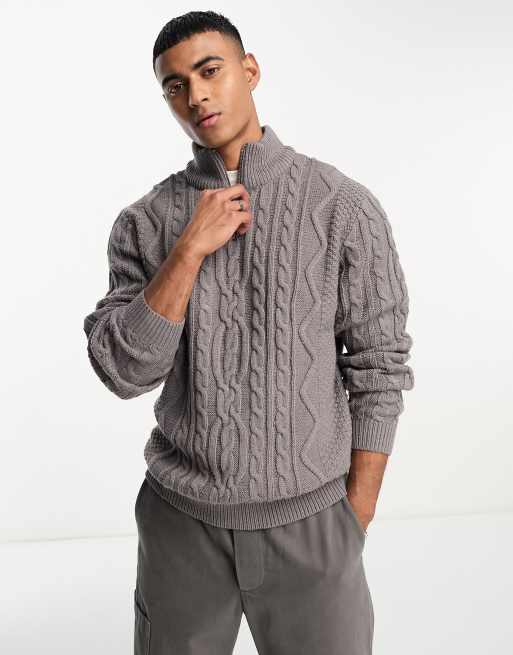 ASOS DESIGN – Grå, flätstickad tröja med dragkedja i halsen