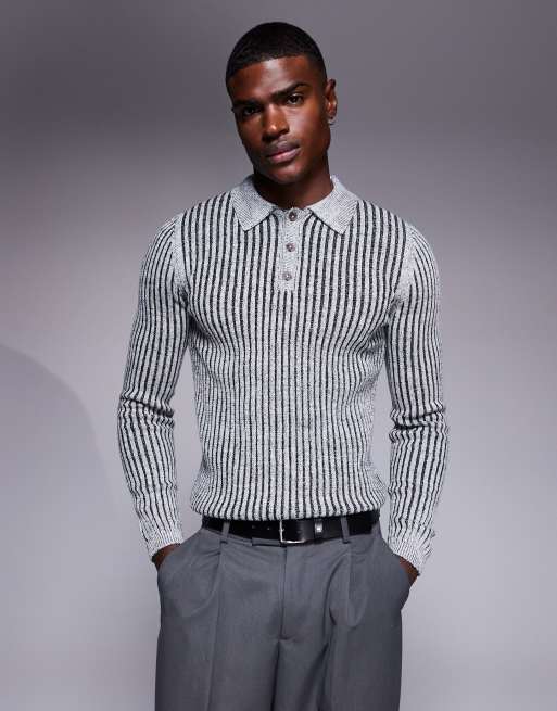 ASOS DESIGN – Grå, ribbstickad pikétröja i muscle fit
