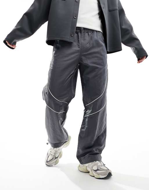 ASOS DESIGN – Grå träningsbyxor i nylon med paneler och kantrand