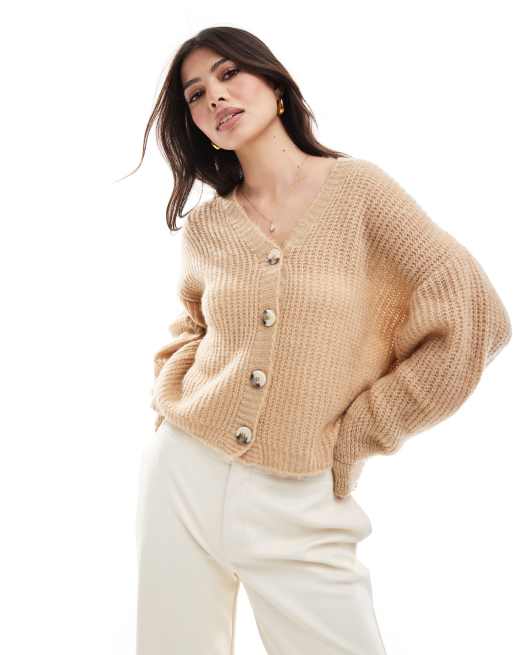 ASOS DESIGN – Gräddvit, brun, stickad och fluffig kofta i oversize