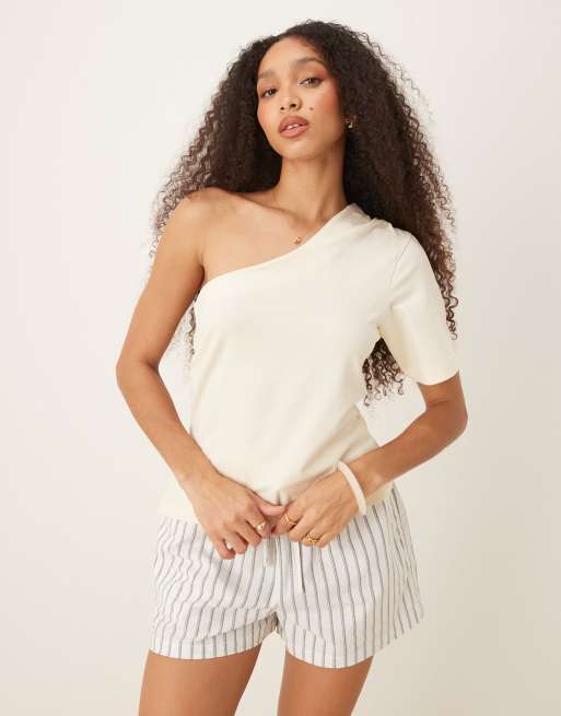ASOS DESIGN – Gräddvit, enaxlad topp med ryschad midja