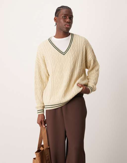 ASOS DESIGN – Gräddvit, flätstickad krickettröja i oversize med grön kantrand