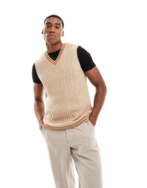 ASOS DESIGN – Gräddvit, flätstickad väst med v-ringning och svart kantrand