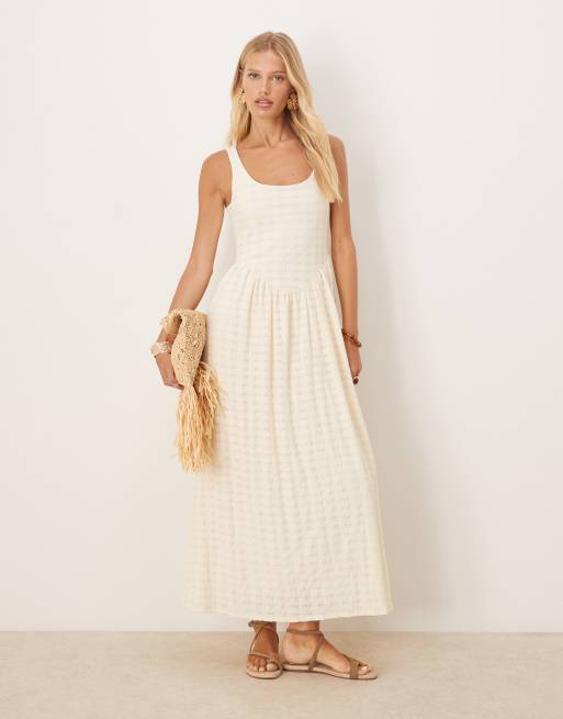 ASOS DESIGN – Gräddvit midiklänning med textur, djup halsringning och sänkt midja