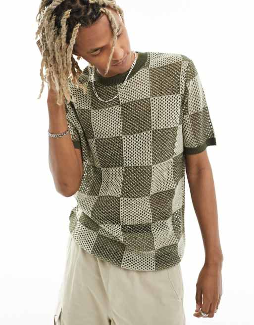 ASOS DESIGN – Gräddvit och kakifärgad, stickad, schackrutig t-shirt i mesh med rund halsringning och avslappnad passform