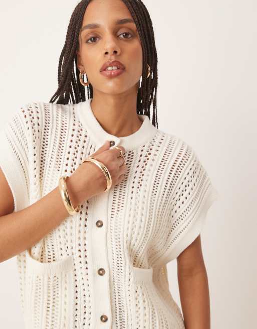ASOS DESIGN – Gräddvit, pointellestickad kostymväst med rund halsringning och boxig passform