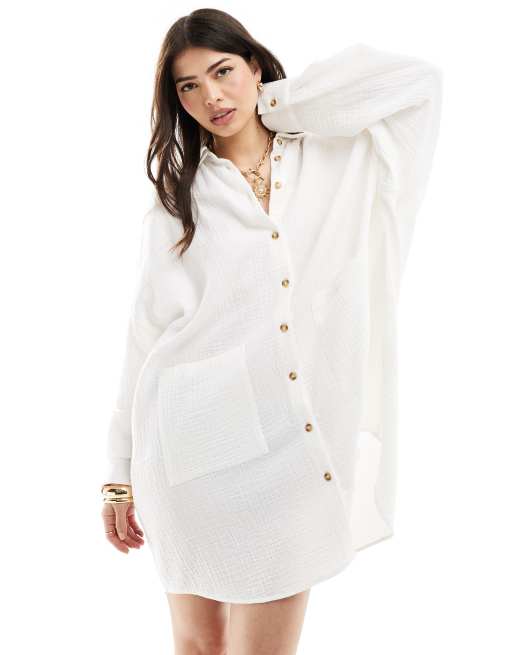 ASOS DESIGN – Gräddvit skjortklänning i oversize och dubbelt tyg med sänkta fickor