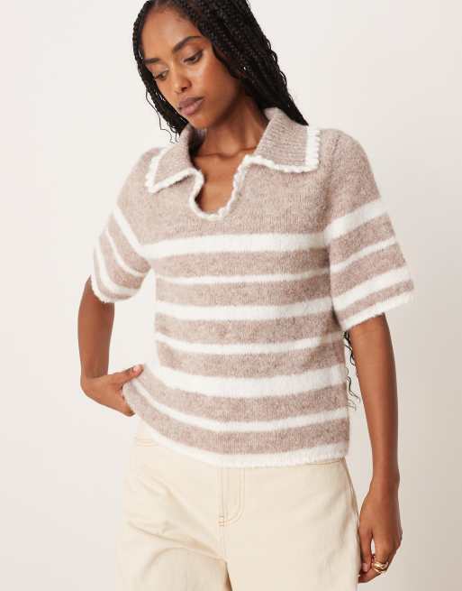 ASOS DESIGN – Gräddvit, stickad pikétröja med korta ärmar och volang