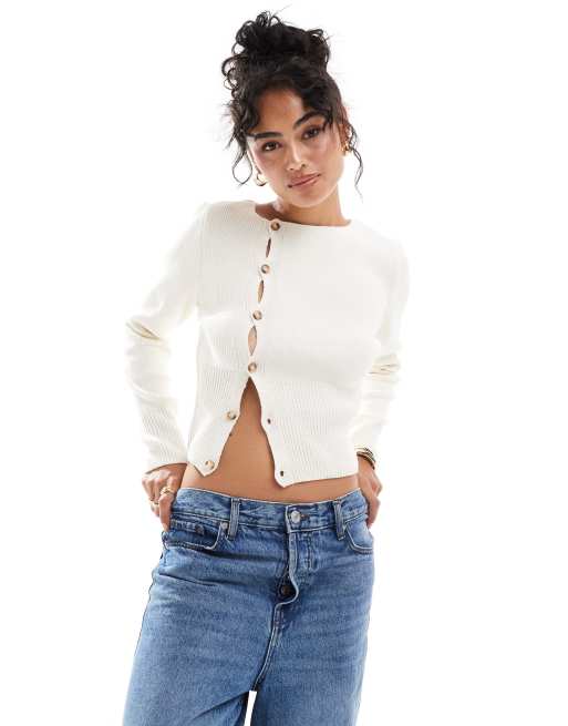 ASOS DESIGN – Gräddvit, stickad, ribbad kofta med rund halsringning