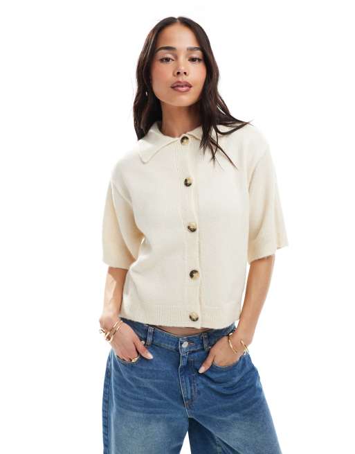 ASOS DESIGN – Gräddvit, stickad skjortkofta med korta ärmar