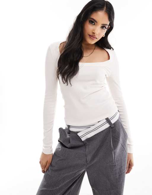 ASOS DESIGN – Gräddvit t-shirt med fyrkantig, djup halsringning och långa ärmar