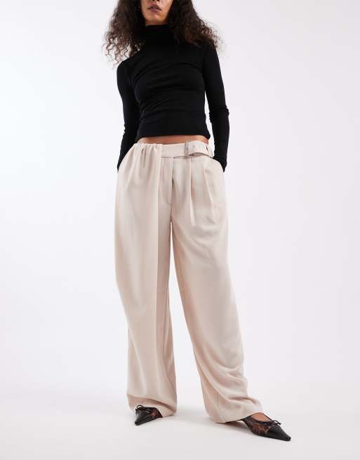 ASOS DESIGN – Gräddvita, figursydda byxor med vida ben, skärpdetalj och veckat överlager