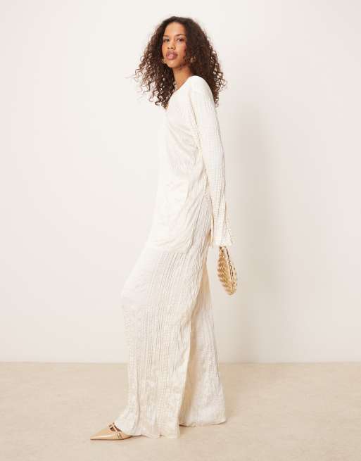 ASOS DESIGN – Gräddvitt, krinklat satinset med långärmad topp och byxor med vida ben