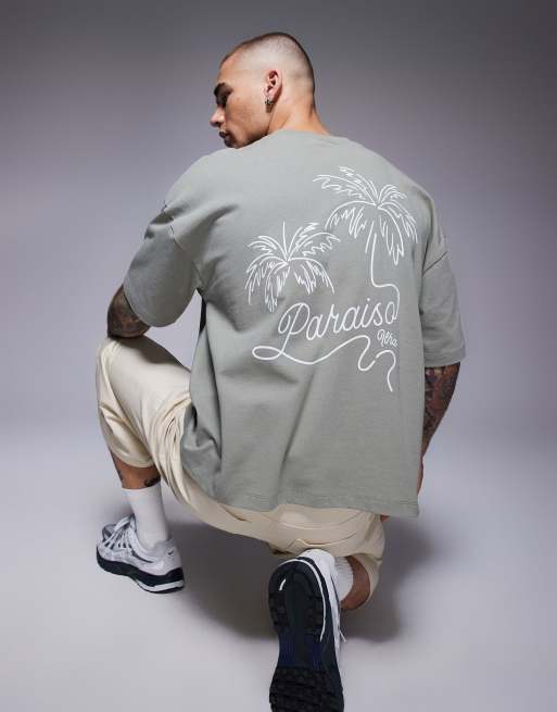ASOS DESIGN – Grågrön t-shirt i oversize med boxig passform och palmtryck