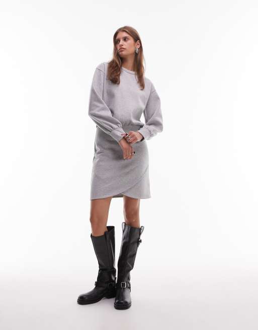 ASOS DESIGN – Gråmelerad miniklänning i sweatshirttyg med ballongärmar och omlottdesign vid nederkanten
