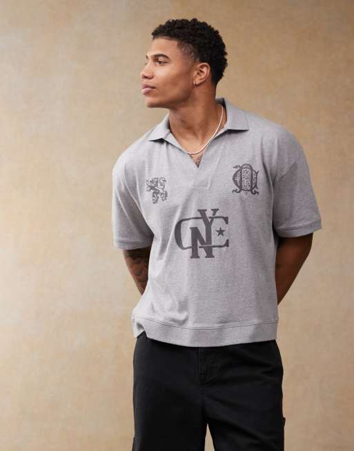 ASOS DESIGN – Gråmelerad pikétröja i oversize med boxig passform och sporttryck