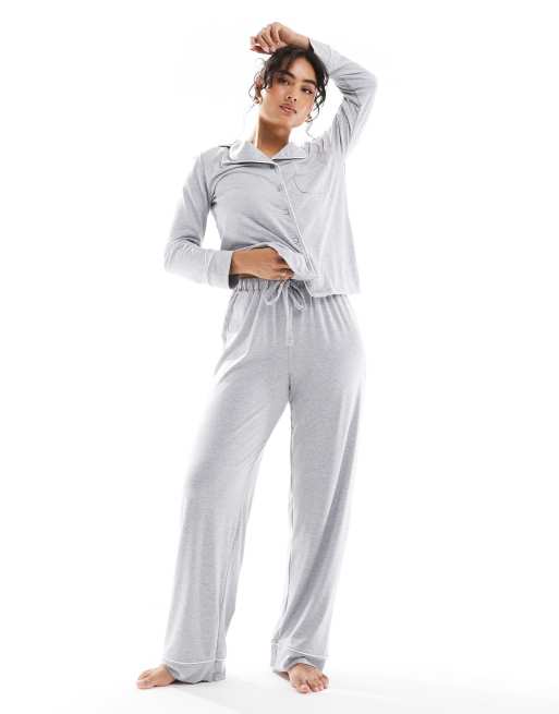 ASOS DESIGN – Gråmelerad, supermjuk pyjamas med långärmad skjorta och byxor med kontrasterande kantband