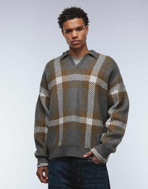 ASOS DESIGN – Grårutig, stickad tröja i oversize och pikékrage med sprund