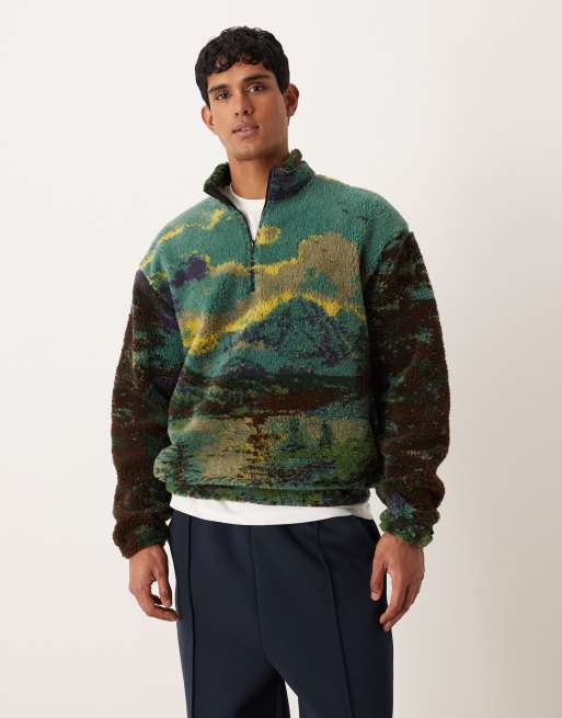 ASOS DESIGN – Grön, avslappnad sweatshirt med kort dragkedja vid halsen och sceniskt tryck i teddy