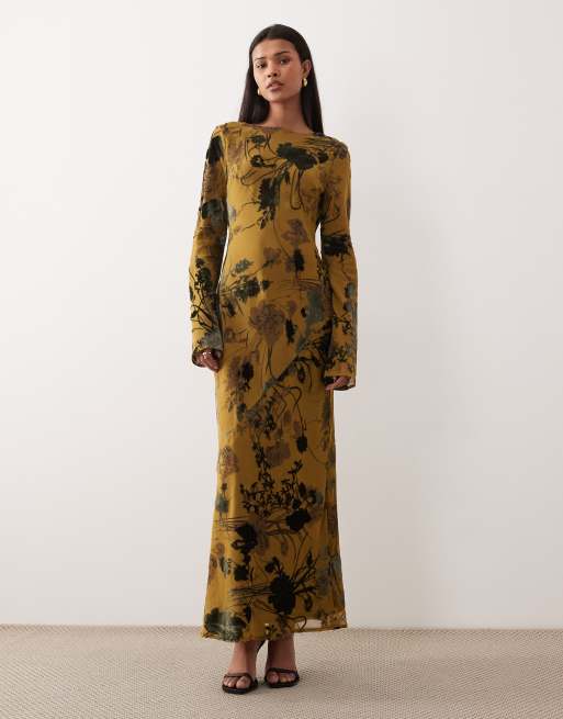 ASOS DESIGN – Grön, blommig maxiklänning i devoré med långa ärmar