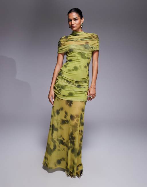 ASOS DESIGN – Grön, blommig maxiklänning i mesh med skirt överlager
