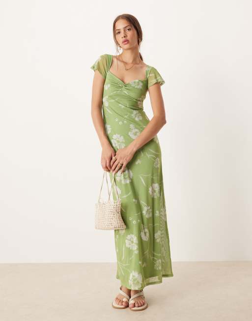 ASOS DESIGN – Grön, blommig midi-teaklänning med utsvängda ärmar och snurrad knut framtill