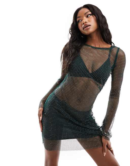 ASOS DESIGN – Grön, långärmad miniklänning med bara axlar och hotfix