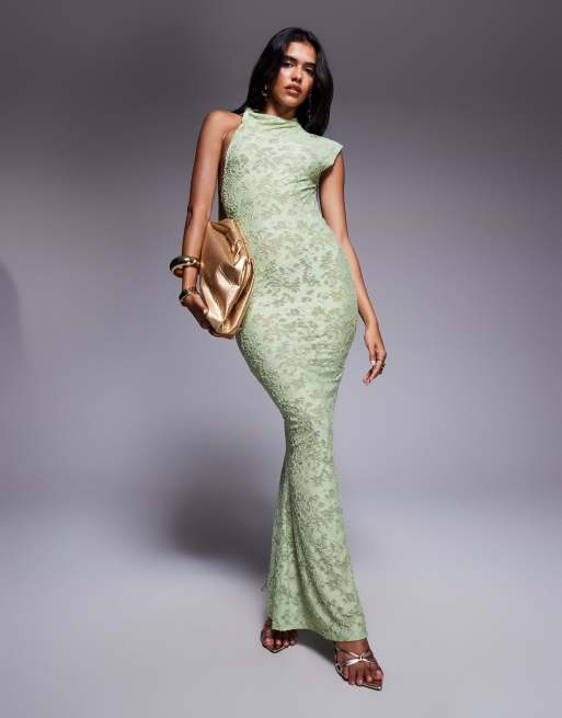 ASOS DESIGN – Grön maxiklänning i devoré med knytning vid halsen