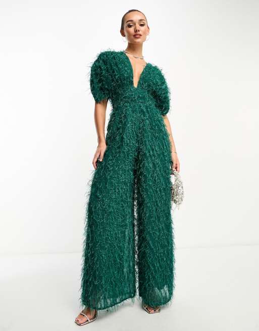 ASOS DESIGN – Grön metallisk jumpsuit i fluffigt material och djup urringning