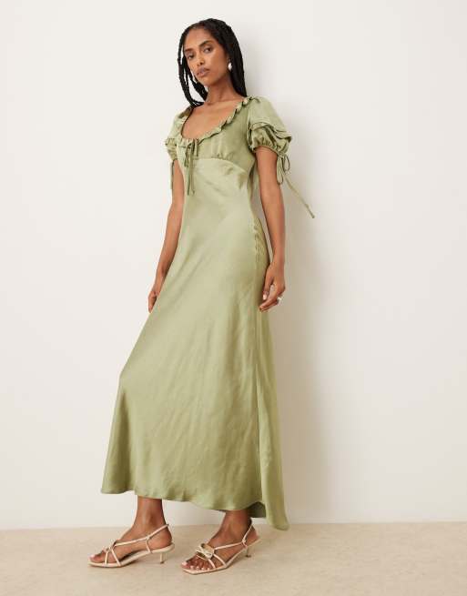ASOS DESIGN – Grön midiklänning i milkmaid-modell med puffärmar och knytning